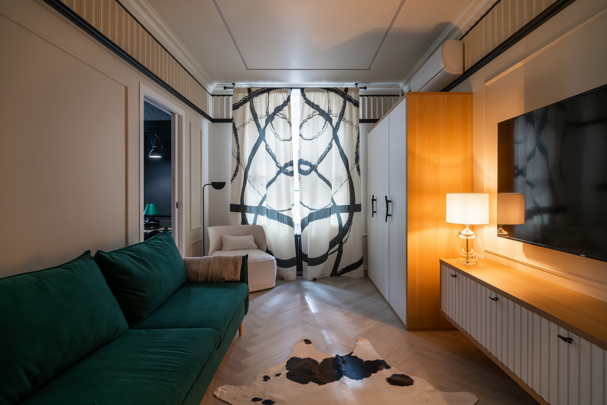 Первым делом дизайнер Ирина Райхер избавилась от многоцветной палитры в гостиной, оставив два основных – черный и белый. При этом, как и хотели герои, в гостиной остался главенствовать белый цвет. А в спальне — черный.